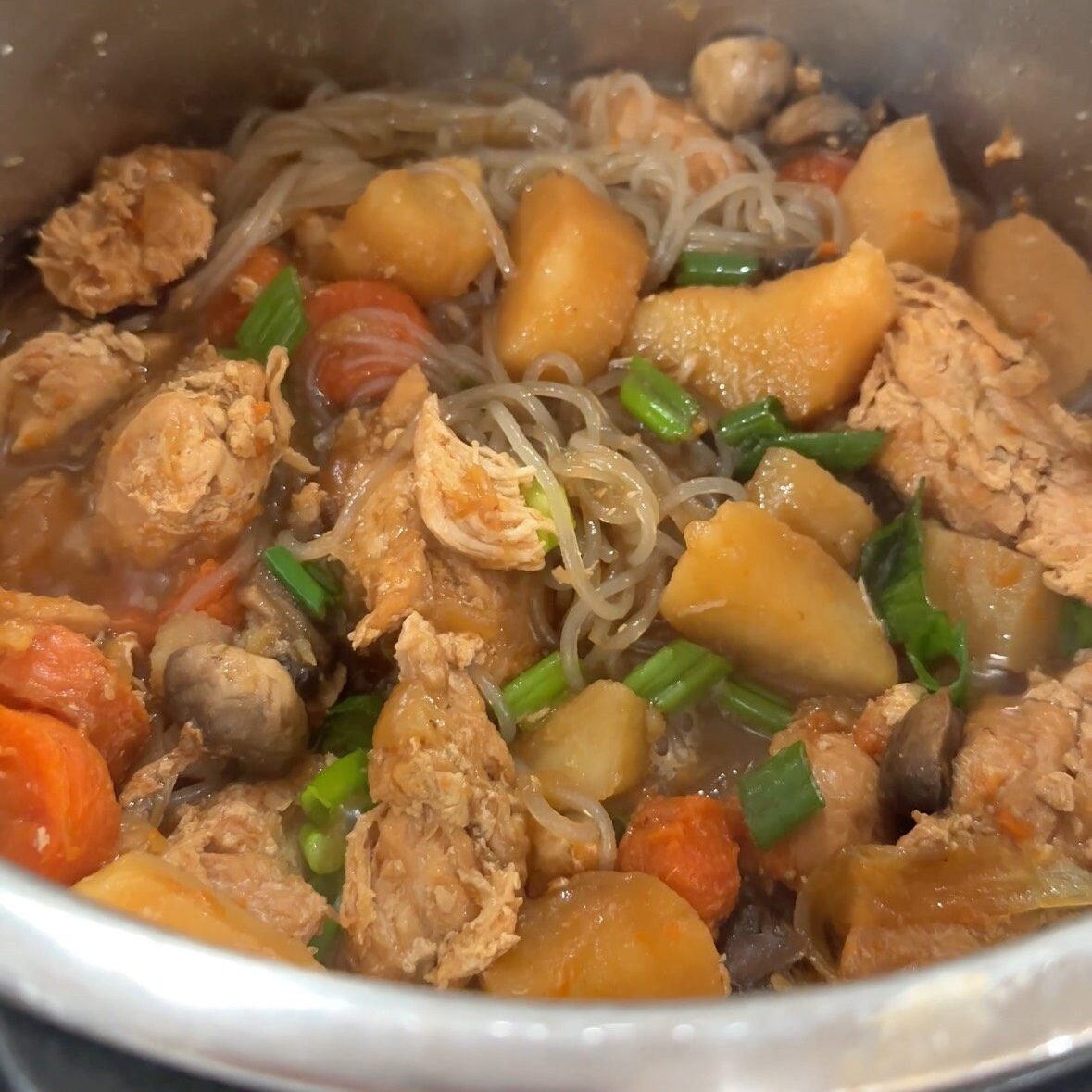 6. When the stew is done, turn the “SAUTE” function on and add your cooked glass noodles and toss them in the sauce quickly until evenly coated (~2 minutes.)