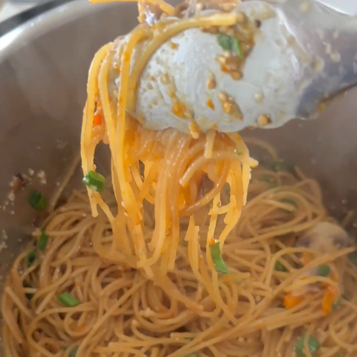 6. Press “SAUTE” on 3 minutes and quickly stir the pasta with the sauce to break apart any clumped pasta and to mix in the sauce further. Drizzle 1 tbsp of sesame oil, add your chopped scallions and sesame seeds and quickly toss everything together.