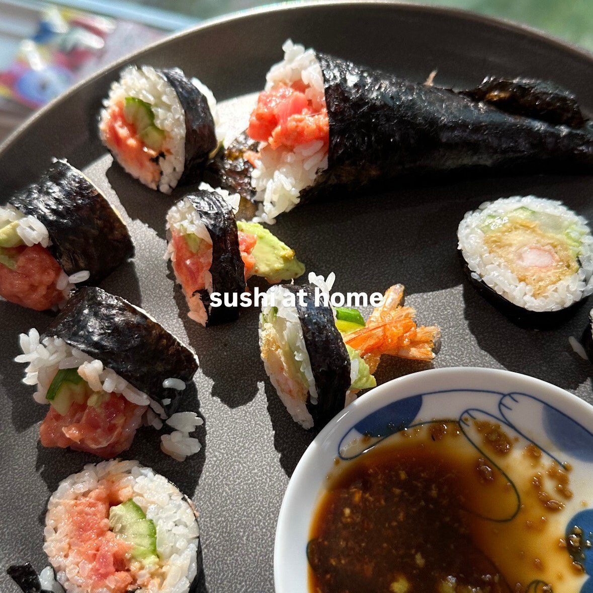 8. Cut into smaller portions. Serve with soy sauce and wasabi and enjoy!