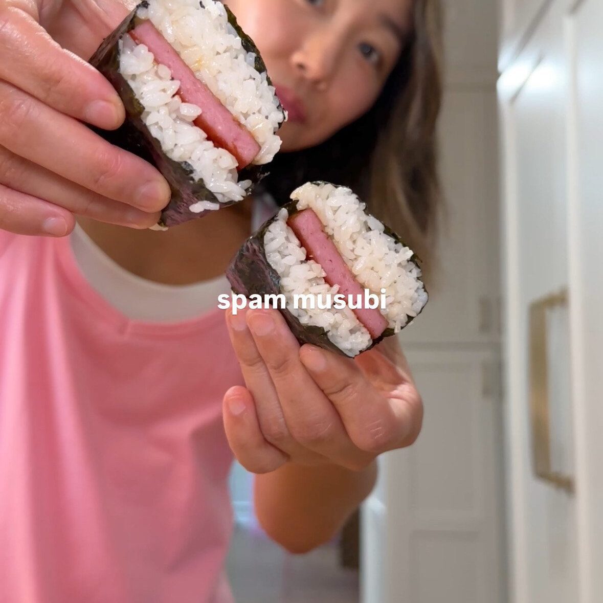 4. To mold the musubi, start by placing a sheet of nori with the rough side up on a cutting board. Place a Spam musubi mold in the middle of the nori sheet and place rice – spam – rice into the mold. If you don’t have a mold, you can line a cleaned Spam can with Saran wrap and add the ingredients in the same order. Press the rice down firmly with a musubi press or with your hands. One the rice feels firm, press the mold press down with one hand and pull the mold upward with the other hand. Wrap the nori around the rice-spam-rice stack. When the nori is settled, cut the Spam musubi in half.