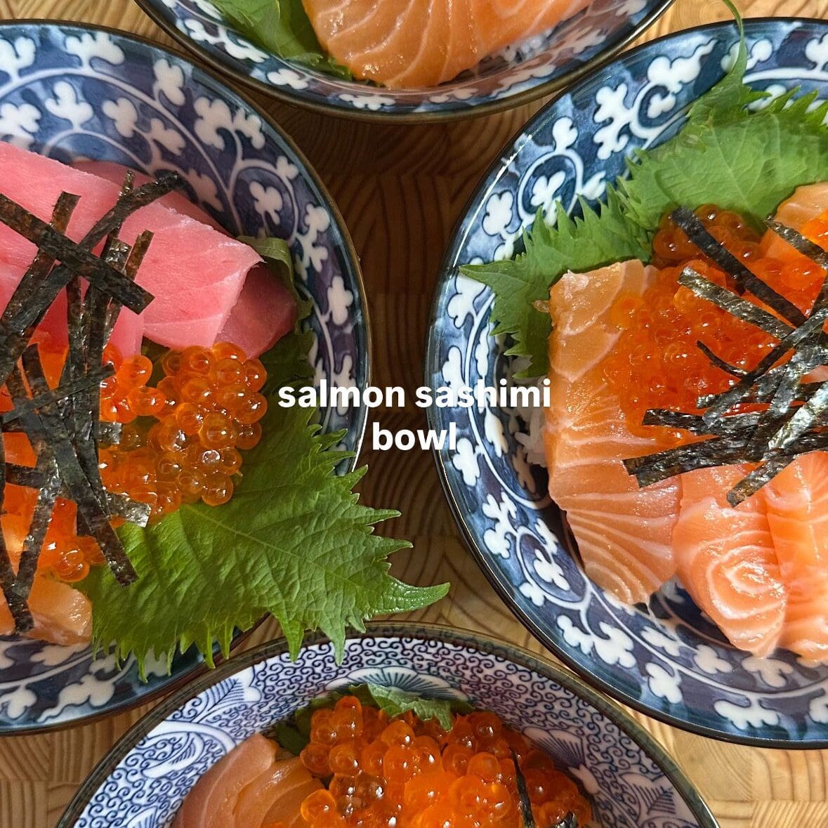 2. Assemble the bowl by first making a bed of cooked sushi rice then placing the sashimi slices, avocado and cucumbers on top.